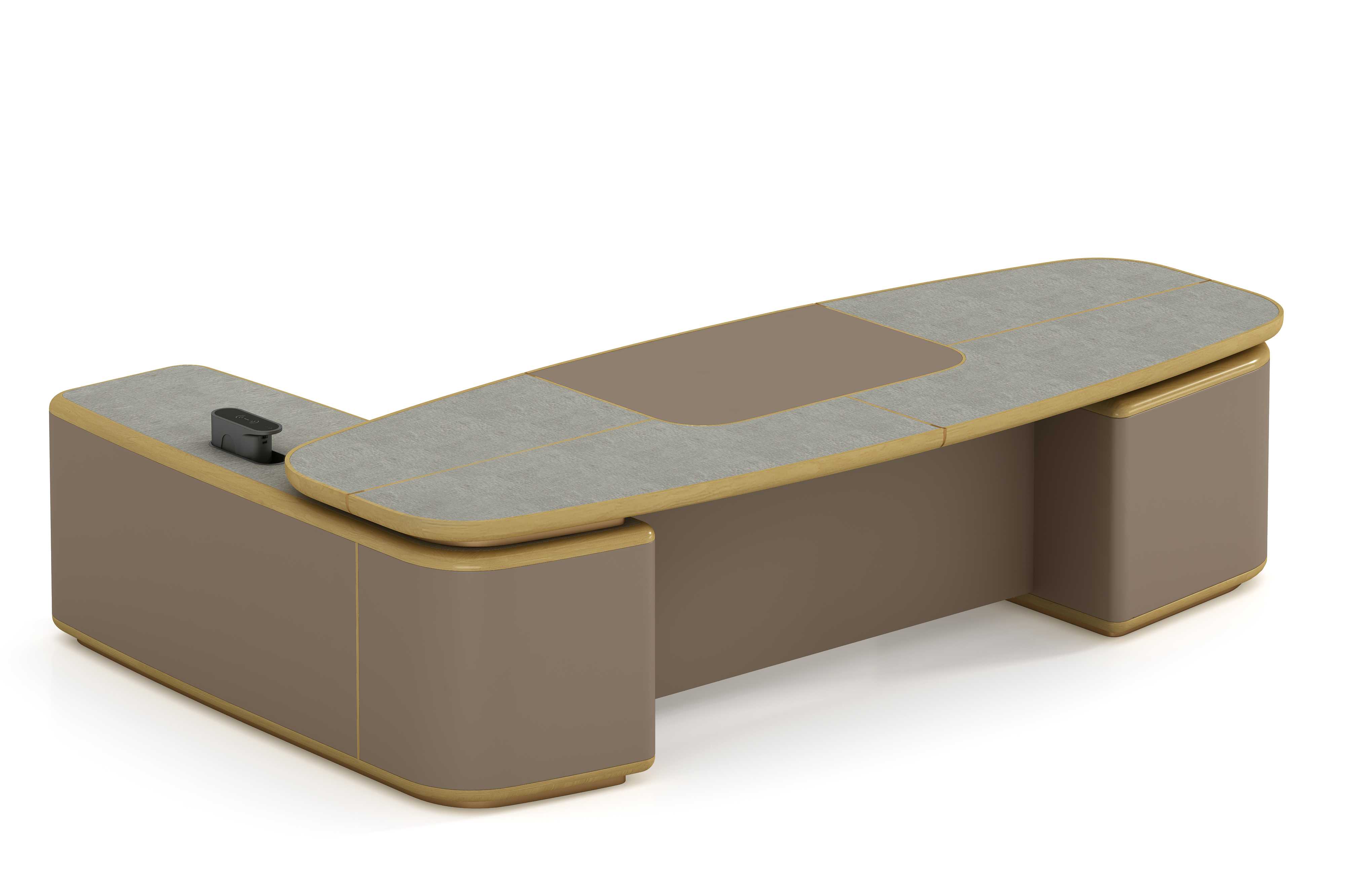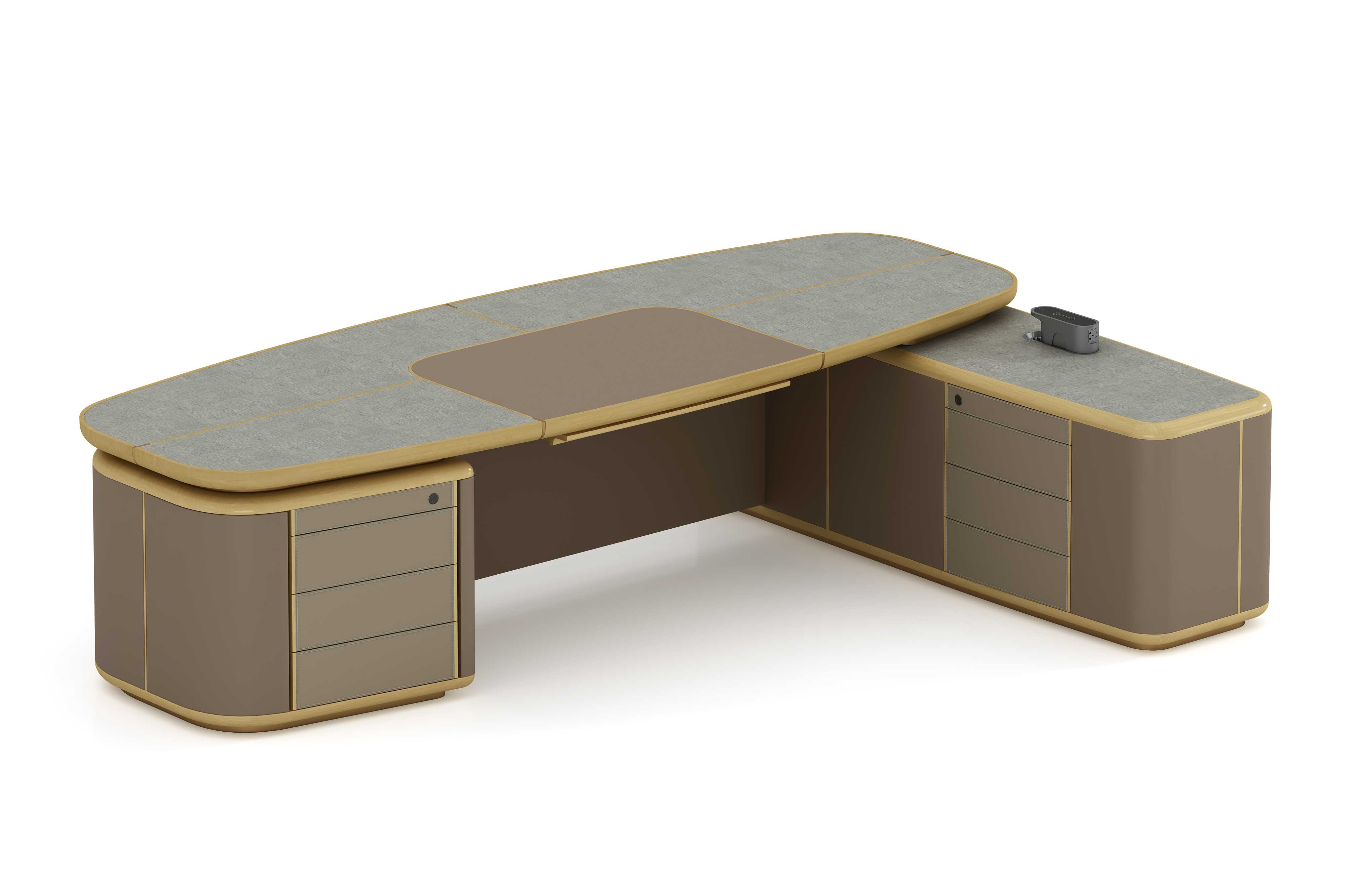 1.工艺:见光面采用E0级中密度纤维板+0.6mm染色木皮做水性漆/实色水性漆 2.封边:见光面天然木皮封边/实色水性漆+枫木实木封边 3.细节:台面带固定皮垫,抽面扪皮; 4.配件:“BMB”缓冲门铰+隐藏式按弹导轨+指纹三联锁+明装式反弹器+吊文具抽; 5.五金:底座\支撑采用玫瑰金不锈钢框,台面配玫瑰金不锈钢装饰件; 6.走线:台面配按弹过线电源,副柜内部走线,内配∅80圆形过线盒,配超级电源; 7.班台分左右;