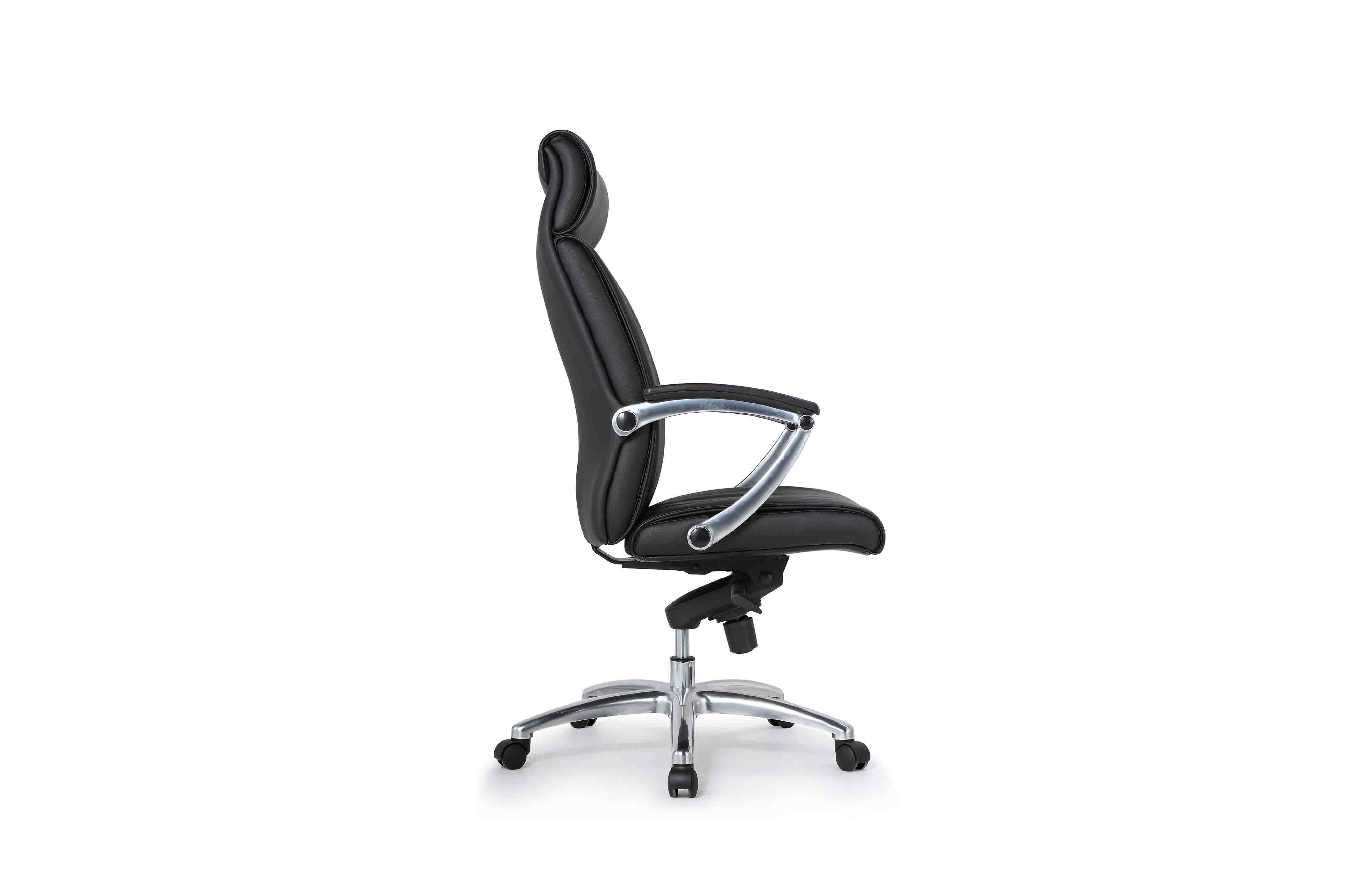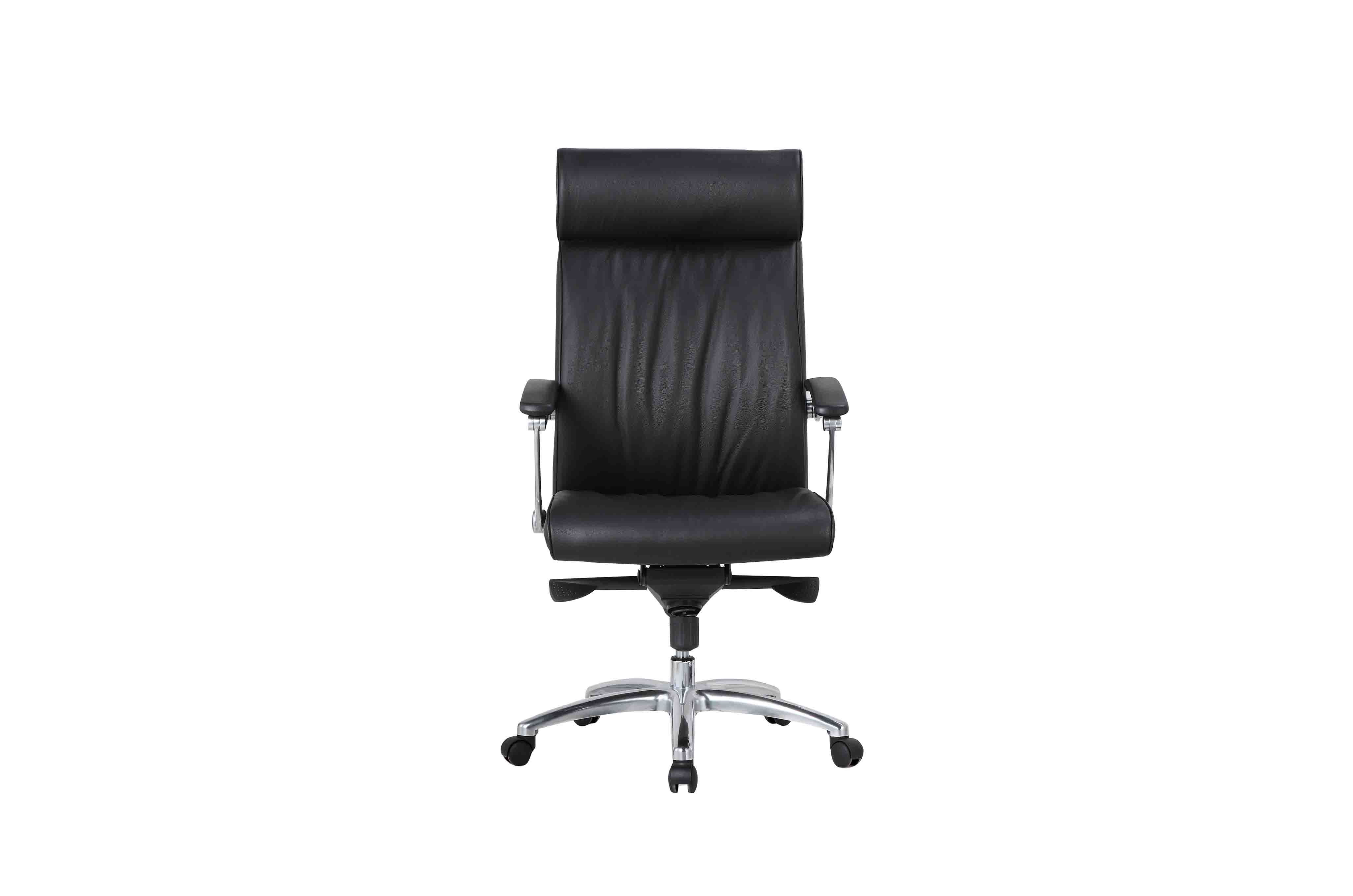 1.优质皮革饰面; 2.高背带头枕椅背一体; 3.JS-11-2铝合金扶手; 4.高密度高回弹海绵; 5.青蛙带托多功能底盘; 6.韩国品牌威亚斯4级气杆; 7.铝合金面包脚; 8.尼龙面包轮;