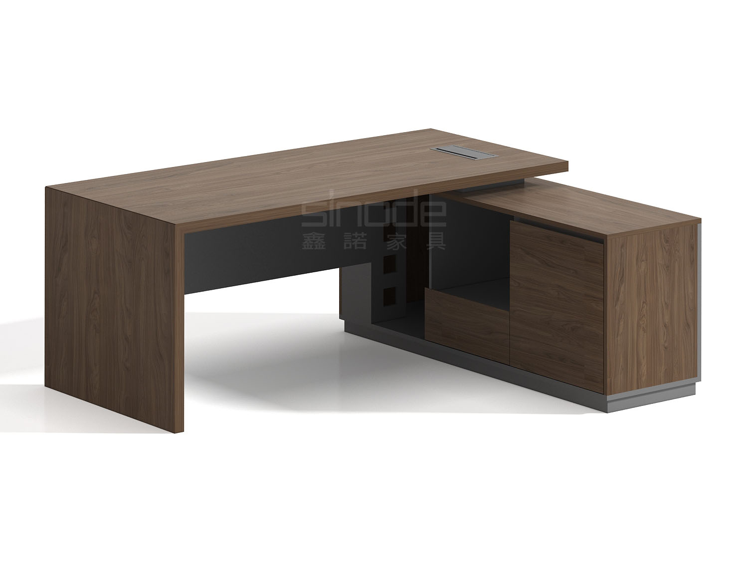 1.工艺:采用E0级刨花板贴三聚氰胺饰面; 2.封边:采用优质PVC封边; 3.细节:台面与台脚做海棠角工艺,上下各留3MM工艺垂直倒角; 4.配件:优质门铰+优质三节导轨; 5.走线:台面配OP线盖,副柜内部走线,内配∅80圆形过线盒+86线盒孔; 6.选配:可选配皮垫; 7.安装前可左右互换