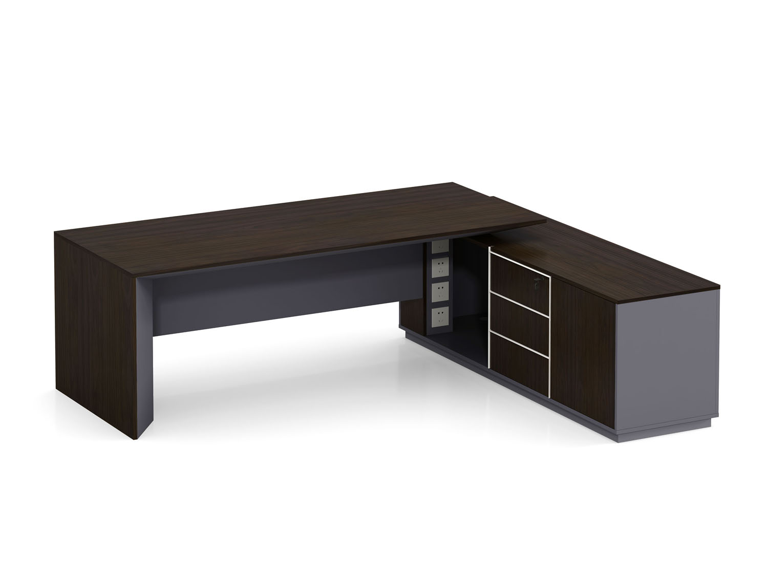 1.基材:采用E0级中密度纤维板+0.6mm天然木皮; 2.油漆:台湾大宝水性净味漆; 3.配件:“BIM”牌 缓冲门铰+“BIM”牌阻尼导轨+集成线盒+通体拉手; 4.走线:副柜内部走线,内配∅80圆形过线盒,配OEXH303A集成插座; 5.班台分左右; 6.选配:皮垫;