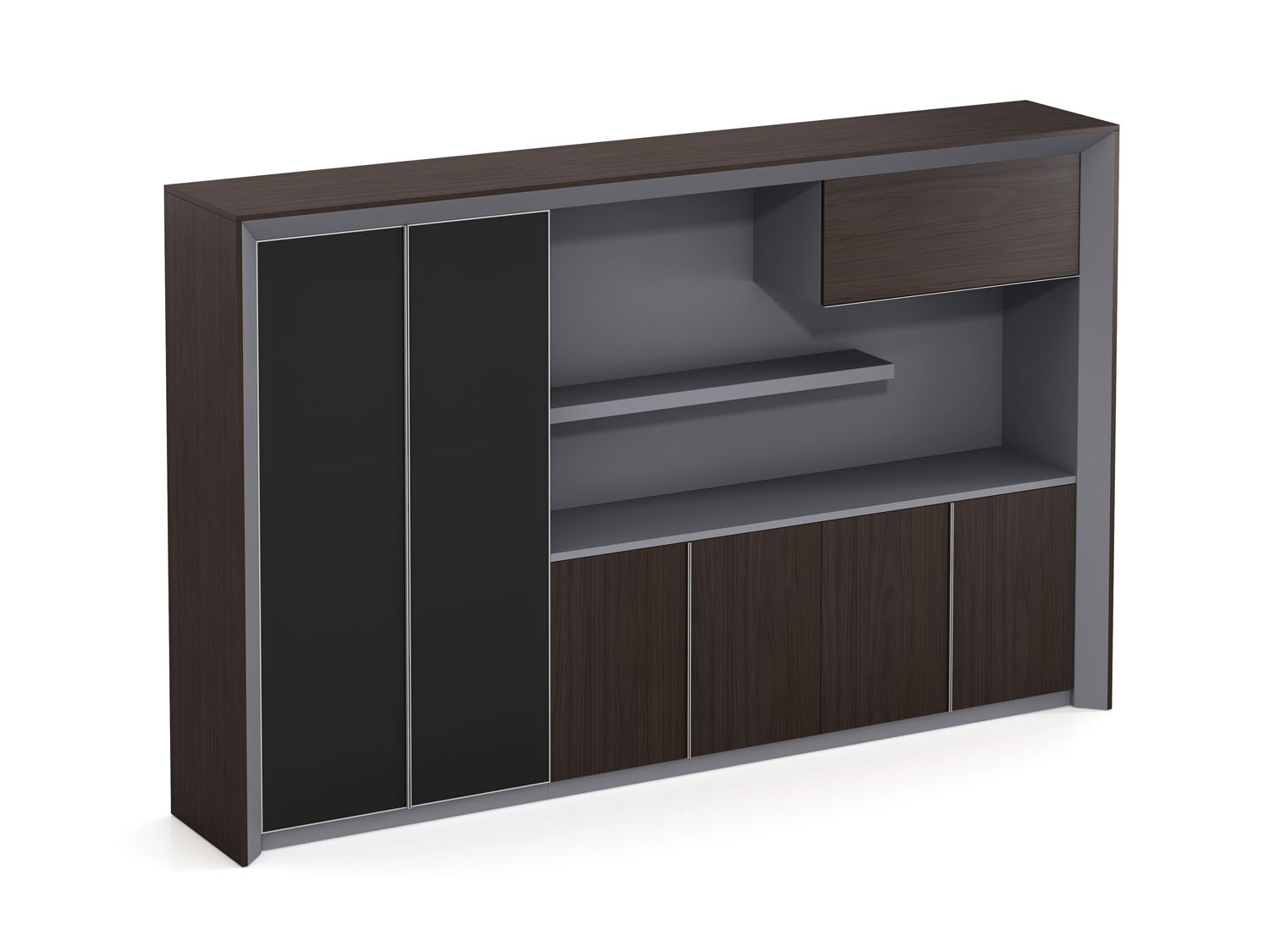 1.工艺:见光面采用E0级中密度纤维板+0.6mm天然木皮做水性漆/实色水性漆,非见光面采用E0级刨花板贴三聚氰胺饰面; 2.封边:见光面天然木皮封边/实色水性漆,非见光面采用优质PVC封边; 3.配件:“BIM”牌 缓冲门铰+铝合金薄边框钢化黑玻璃门+通体拉手;