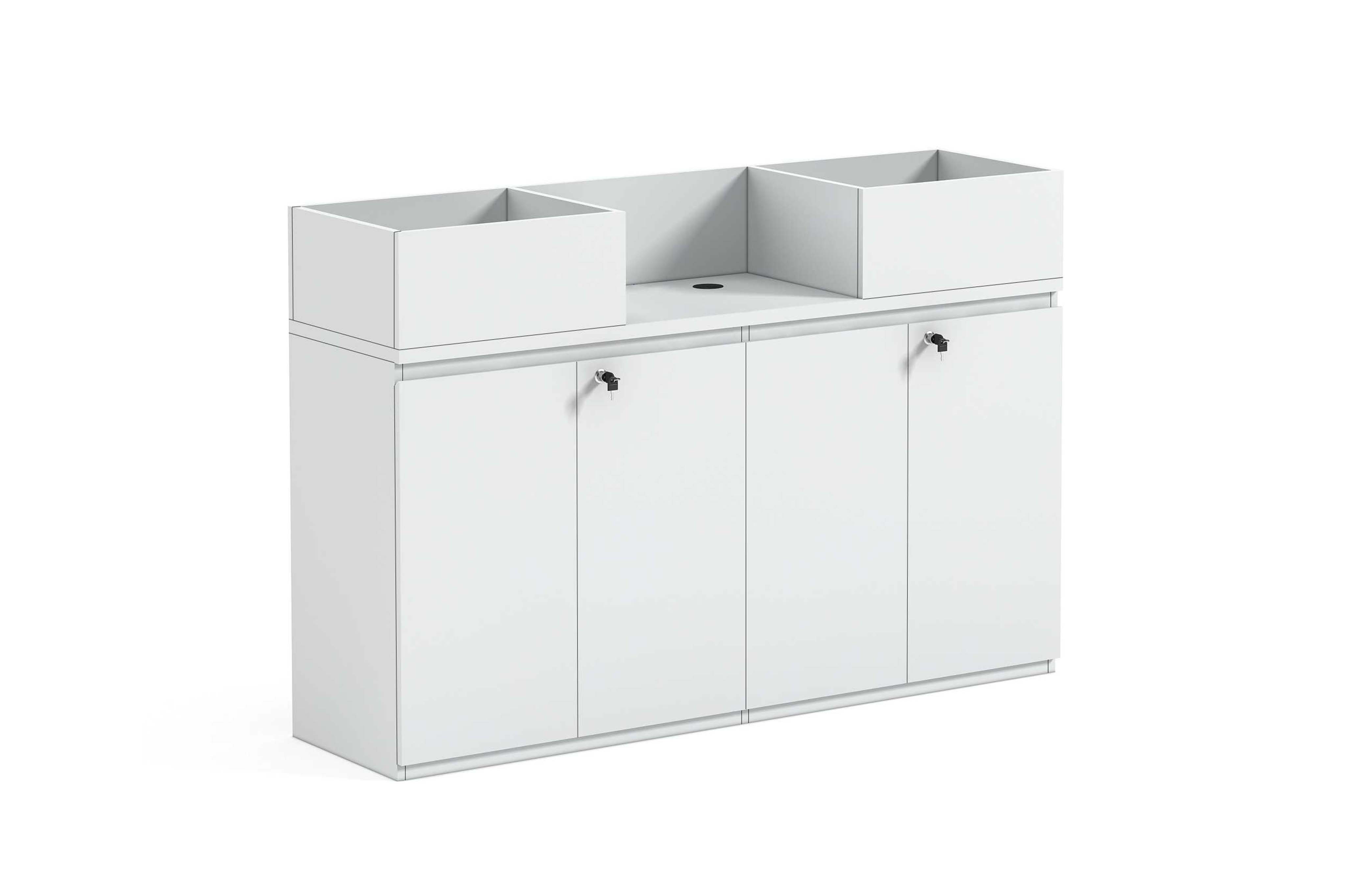 1.工艺:采用E0级刨花板贴三聚氰胺饰面 2.封边:采用优质PVC封边, 3.配件:优质阻尼门铰+优质双门锁+∅80圆形过线盒(可放置450mm以下长度打印机); 4.花槽须做好防水,避免浇水时外溢。