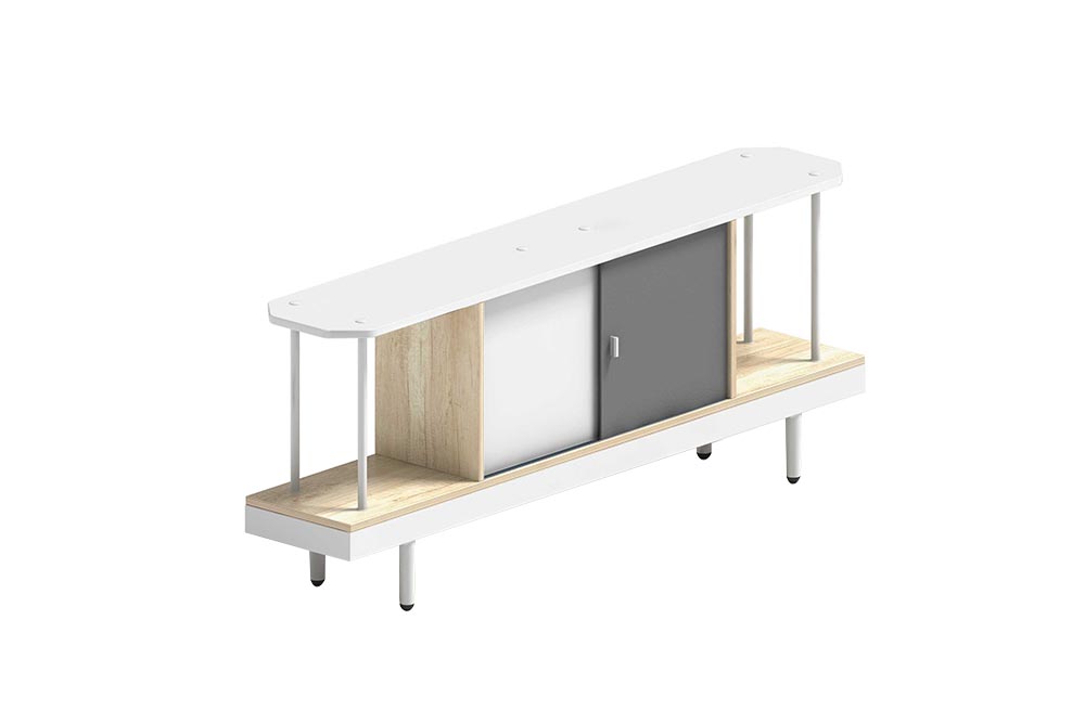 1.工艺:采用E0级刨花板贴三聚氰胺饰面 2.封边:采用优质PVC封边 3.趟门:5mm进口密度板; 4.五金:细磨砂白色金属下架+铝型材支撑柱; 5.配件:镀珍珠铬色铅笔拉手
