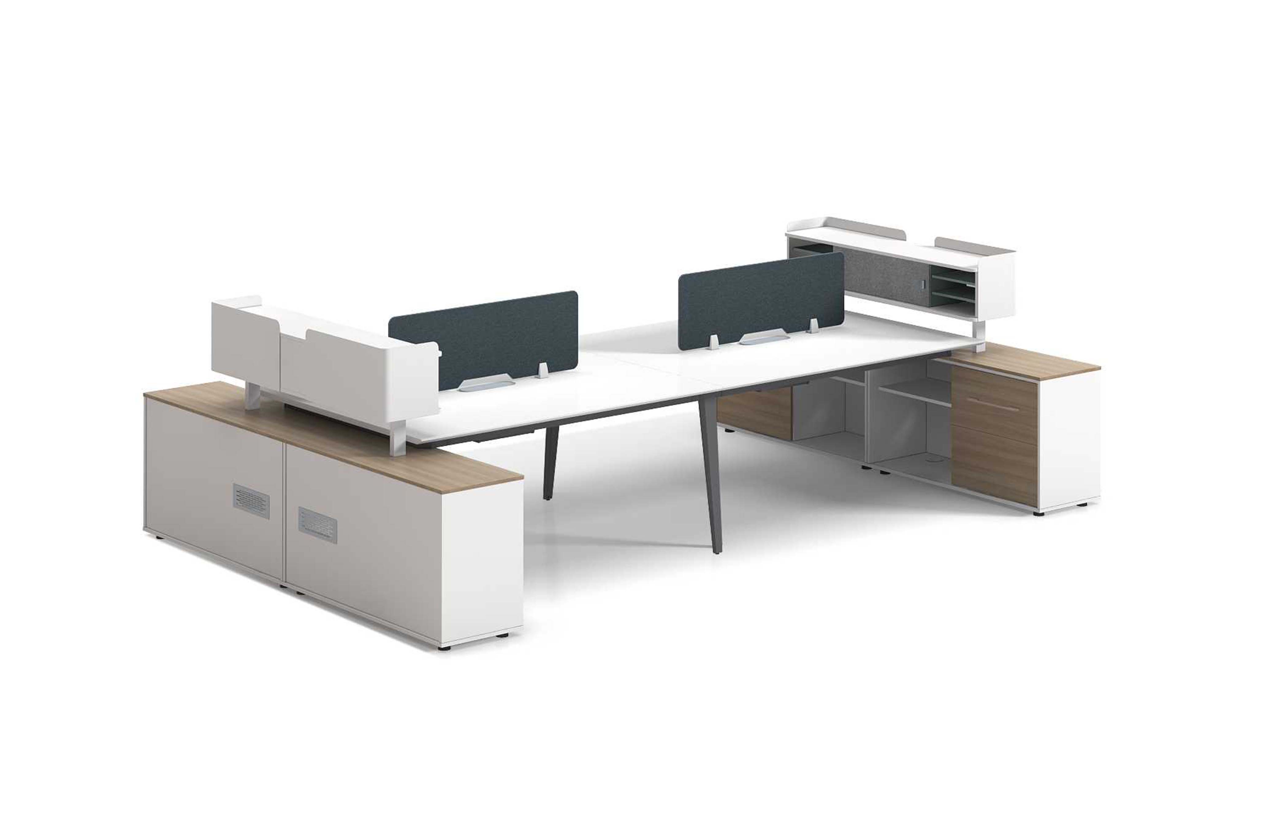 1.工艺:采用E0级刨花板贴三聚氰胺饰面 2.封边:采用优质PVC封边 3.屏风:ML403蓝色皮纹无框桌屏; 4.五金:钢制文件架挡板(壁厚1.5mm)+1.5mm壁厚钢脚+1.6mm壁厚钢制横梁; 5.配件:优质铝合金散热盖+优质铝合金趟门配件+铝合金拉手+优质ABS圆柱形调节脚; 6.走线:台面配OP线盖; 7.选配:可选配多款线槽;