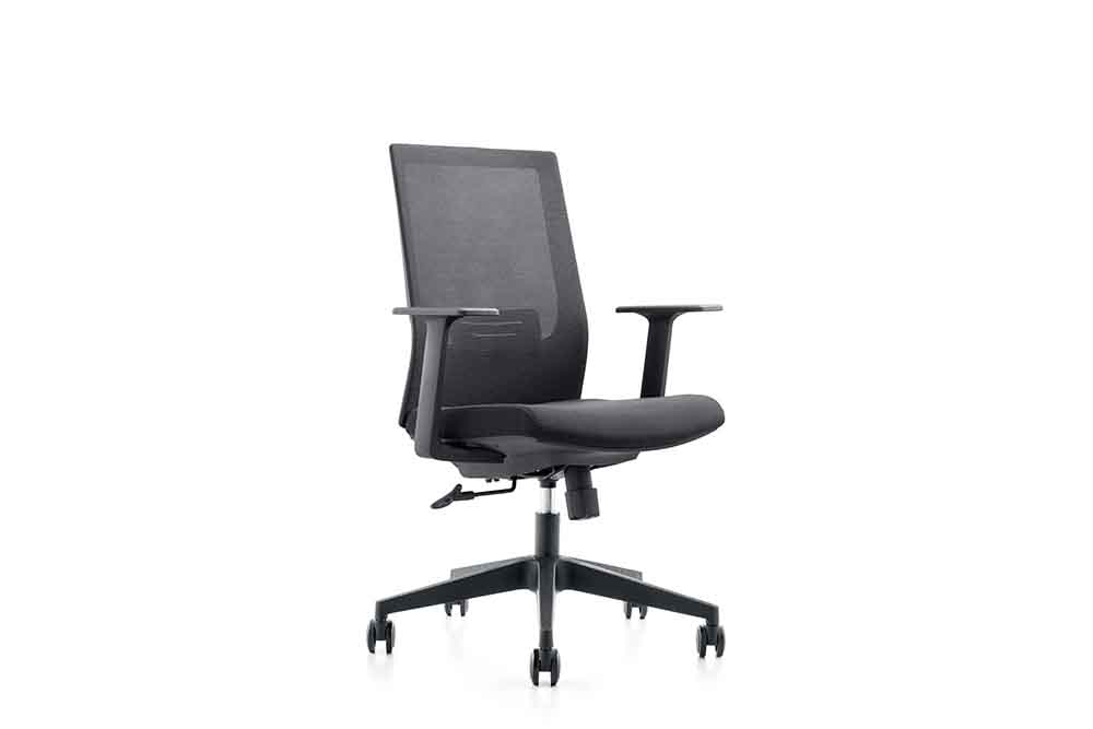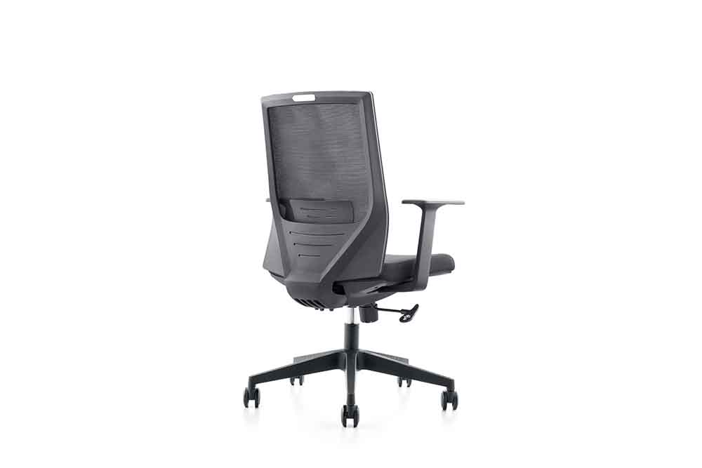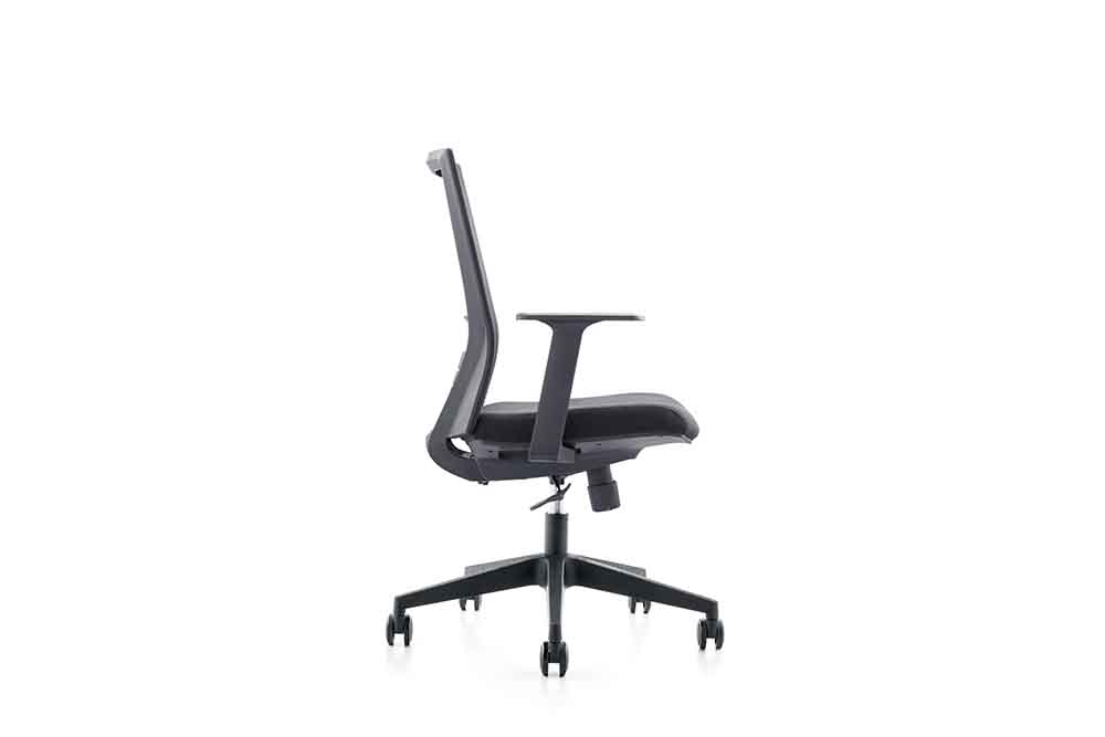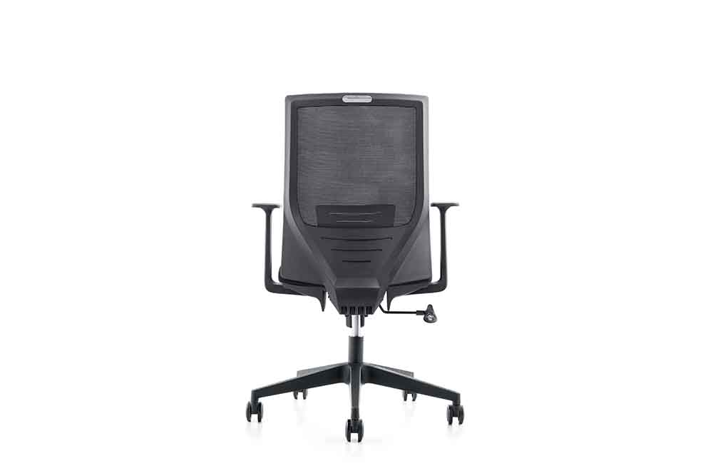 1.黑色PP固定扶手 2.黑色PP加玻纤背架 3.座包采用40#高弹力海绵 4.配中班蝴蝶底盘,带原位锁定功能 5.100沉口7CM黑色气杆 6.320mm黑色尼龙五星脚 7.Ø50mm黑色耐磨尼龙轮