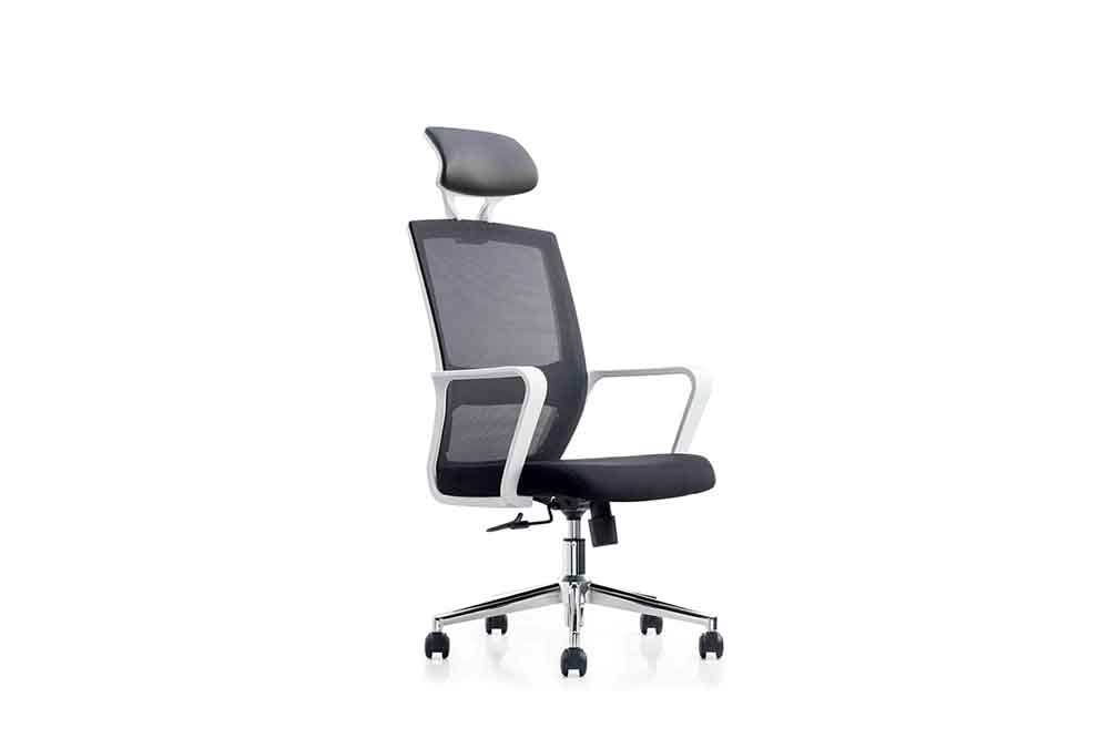 1.布面头枕 2.白色PP固定扶手 3.白色PP加玻纤背架 4.座包采用40#高弹力海绵 5.配中班蝴蝶底盘,带原位锁定功能 6.固定扶手连接椅背和椅座(不车线),自动逍遥贴背功能 7.100沉口7CM电镀气杆 8.320mm电镀五星脚 9.Ø50mm黑色耐磨尼龙轮