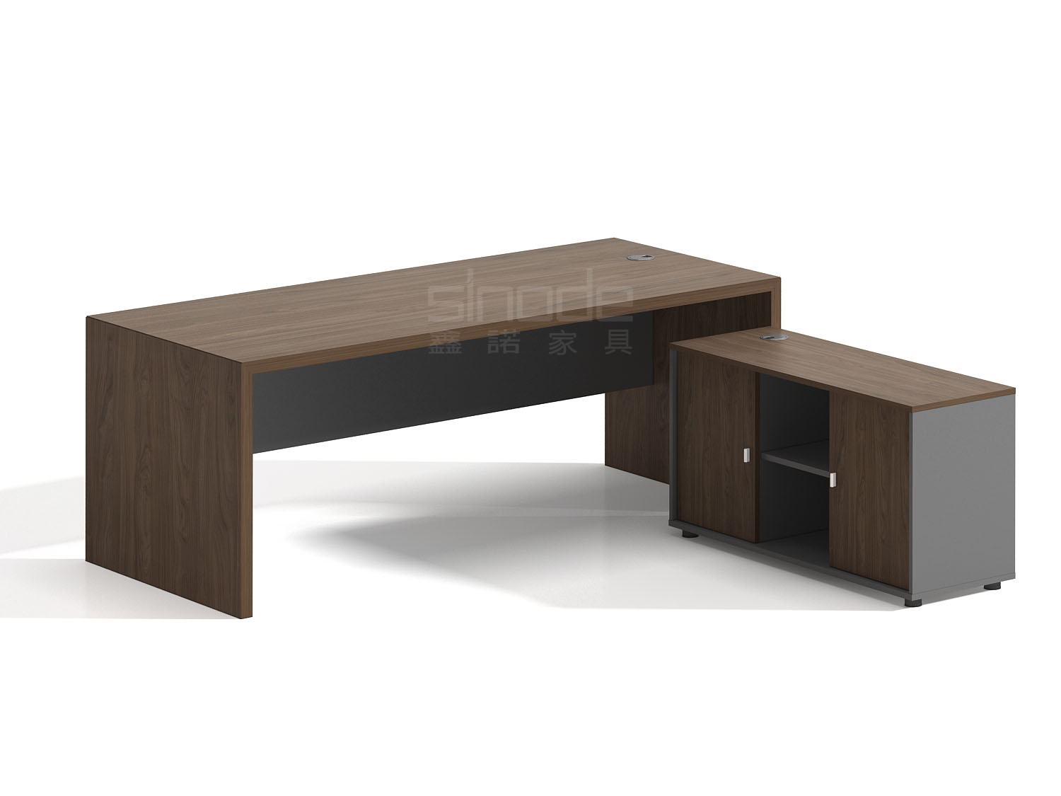 1.工艺:采用E0级刨花板贴三聚氰胺饰面; 2.封边:采用优质PVC封边; 3.细节:台面与台脚做海棠角工艺,上下各留3MM工艺垂直倒角; 4.配件:优质门铰+优质三节导轨; 5.走线:台面、副柜内部走线,内配OG过线盖盒; 6.选配:可选配皮垫;