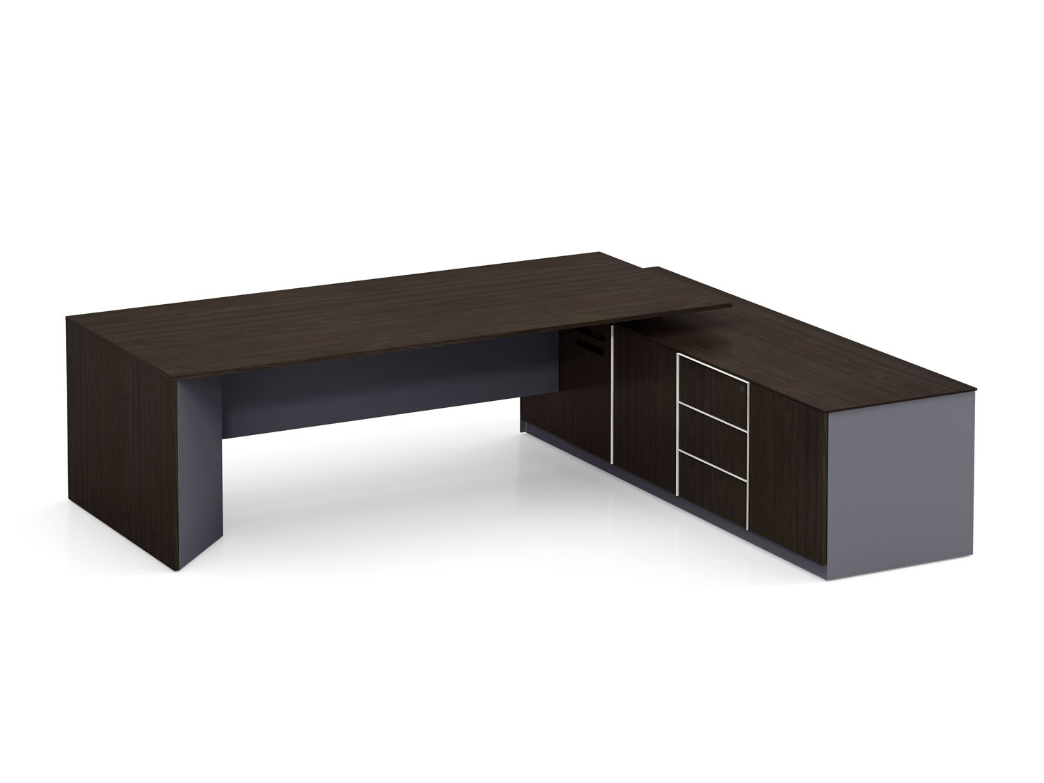 1.基材:采用E0级中密度纤维板+0.6mm天然木皮; 2.油漆:台湾大宝水性净味漆; 3.配件:“BIM”牌 缓冲门铰+“BIM”牌阻尼导轨+指纹式智能密码锁+集成线盒+通体拉手; 4.走线:副柜内部走线,内配∅80圆形过线盒,配OEXH303A集成插座; 5.班台分左右; 6.选配:皮垫;