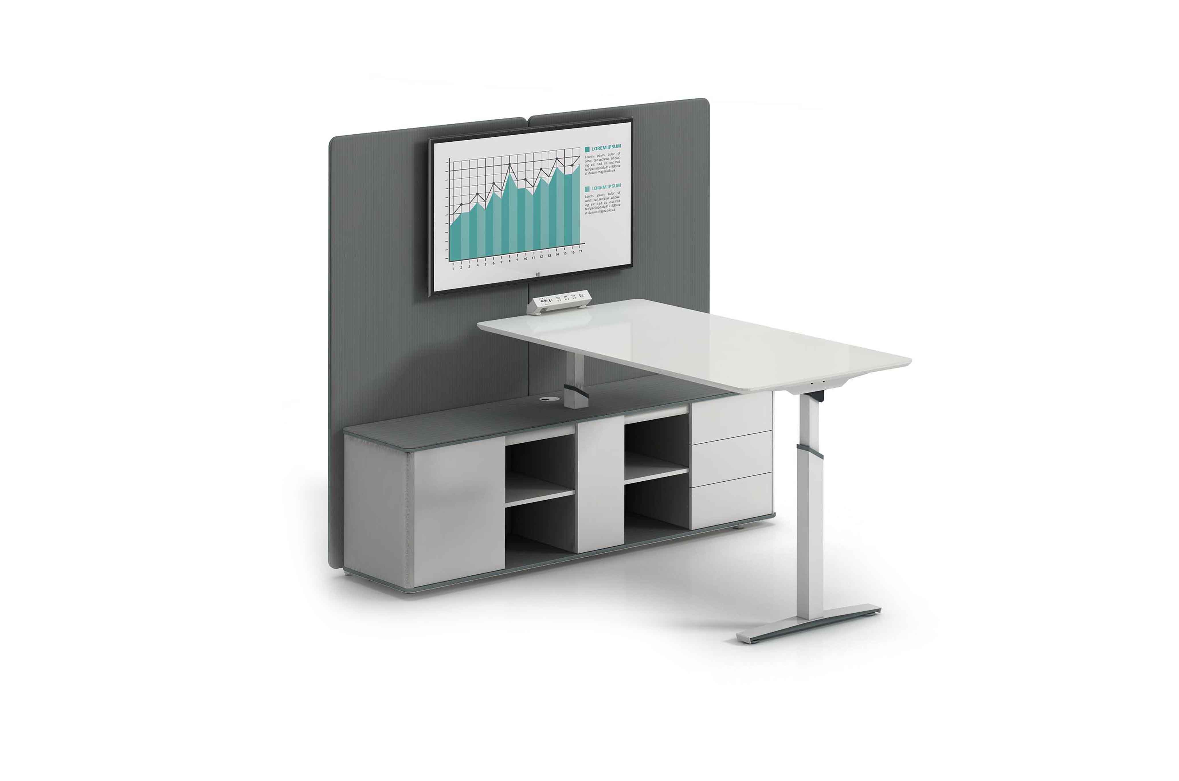 1.工艺:E0级中密度纤维板+做实色水性漆,其余采用E0级刨花板贴三聚氰胺饰面 2.封边:实色水性漆、优质PVC封边 3.细节:副柜台面灰色扪皮,优质胶条封边 4;五金:双电机升降桌脚,四档高度记忆,遇阻回退功能,配三通弹簧线; 5.配件:“BMB”阻尼门铰+“BMB”缓冲三节导轨+锌合金挡板夹+智能密码锁+优质ABS脚垫; 6.台面配大白双面六插电源,副柜内部走线,配∅60圆形过线盒;