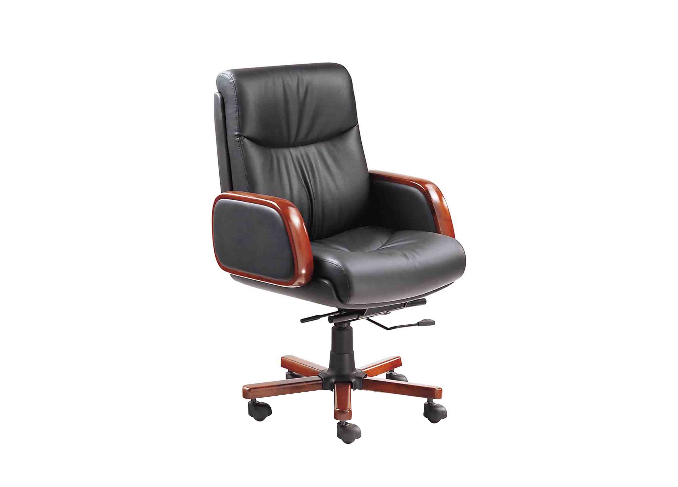 1.优质皮革饰面; 2.纯白高密度海绵; 3.实木油漆扶手; 4.飞机底盘; 5.韩资品牌威亚斯电镀4级气杆; 6.实木油漆五星脚; 7.大班尼龙轮